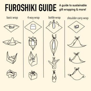 - The Japanese art of using fabric to wrap items for gifting and also transportation, can create beautiful gifts, regardless of the shape of the item – no more ripping paper wrapping sharp corners! Furoshiki is based on a series of standard knots and technics – experts run classes in many cities across Aotearoa or try your hand after watching a YouTube tutorial. https://www.youtube.com/watch?v=2f1wQAb6QMM