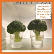 - Broccoli loves sitting in a glass of water, stalk-down, like a bouquet of flowers for your fridge!